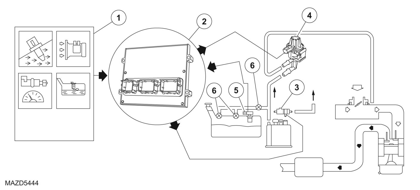 The enhanced EVAP system consists of a fuel tank, fuel filler cap, fuel tank mounted or in-line fuel vapor control valve, fuel vapor vent valve, EVAP canister, fuel tank mounted or fuel pump mounted or in-line fuel tank pressure (FTP) sensor, EVAP canister purge valve or vapor management valve (VMV), intake manifold hose assembly, EVAP canister vent (CV) solenoid, PCM and connecting wires, and fuel vapor hoses. The enhanced EVAP system, including all the fuel vapor hoses, can be checked when a leak is detected by the PCM.