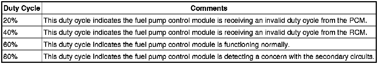 The fuel pump control module communicates diagnostic information to the PCM through the FPM circuit. This information is sent by the fuel pump control module as a duty cycle signal. The 4 duty cycle signals that may be sent are listed in the following table.Fuel Pump Driver Module Duty Cycle Signals