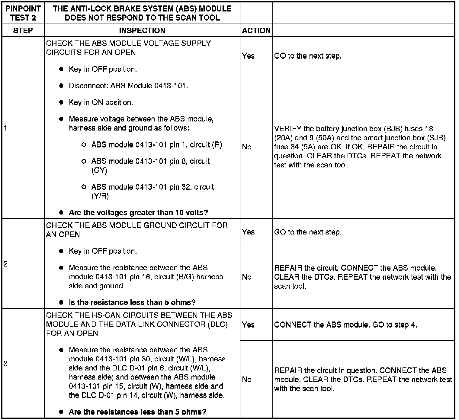 PINPOINT TEST 2: THE ABS MODULE DOES NOT RESPOND TO THE SCAN TOOL