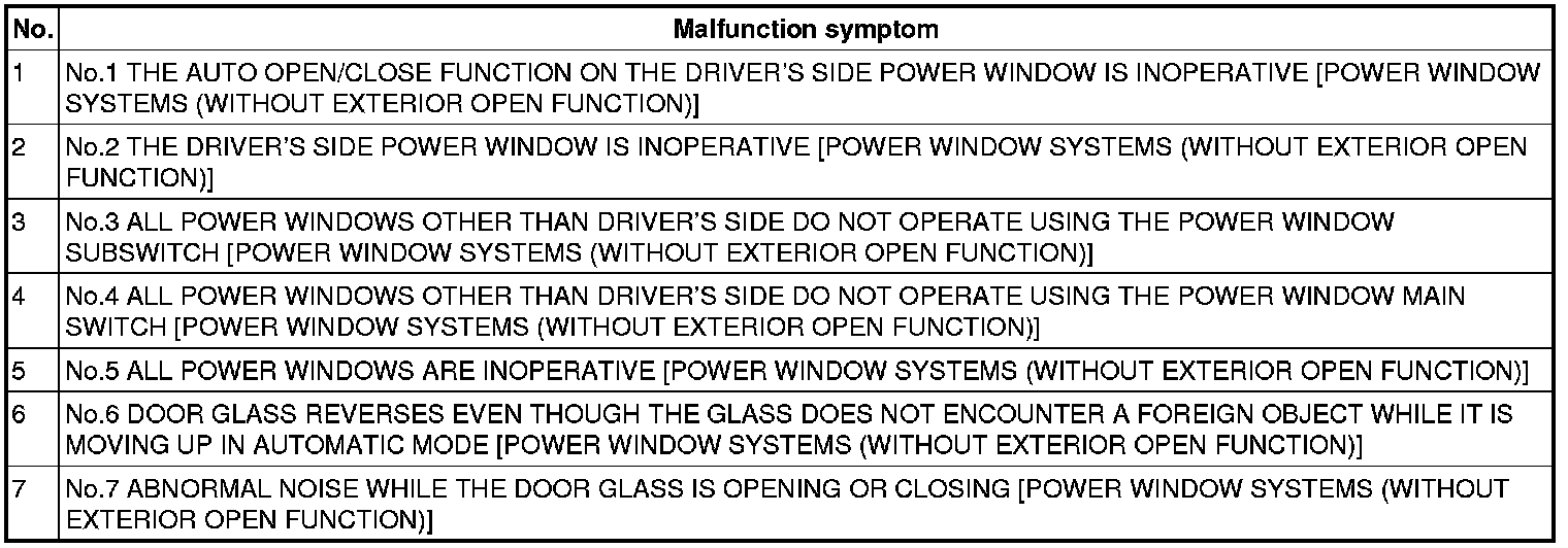 SYMPTOM TROUBLESHOOTING CHART [POWER WINDOW SYSTEMS (WITHOUT EXTERIOR OPEN FUNCTION)]