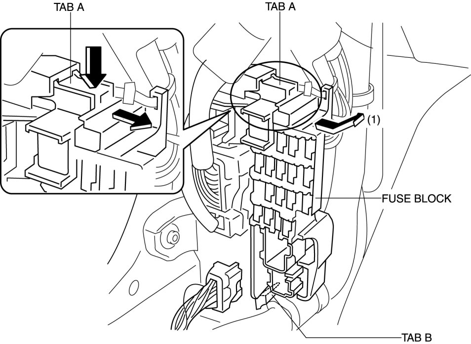 6. Remove tab A as shown in the figure, pull the fuse block in the direction of the arrow (1), and remove tab B.
