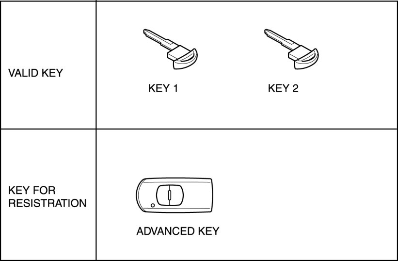 - The "Valid key" or "Valid advanced key" referred to in this information indicates the key that can start the engine.