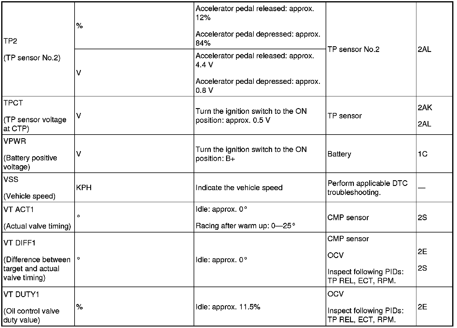 - PIDs for the following parts are not available on this model. Go to the appropriate part inspection.