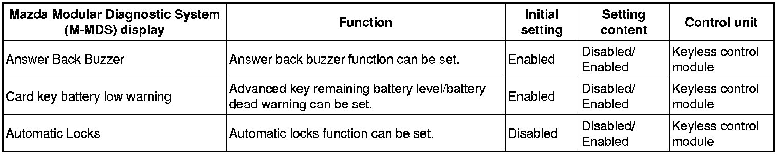Home >> Mazda >> 2011 >> CX-9 AWD V6-3.7L >> Repair and Diagnosis >> Accessories and Optional Equipment >> Antitheft and Alarm Systems >> Keyless Entry >> Testing and Inspection >> Programming and Relearning >> Customized Function Setting Procedure