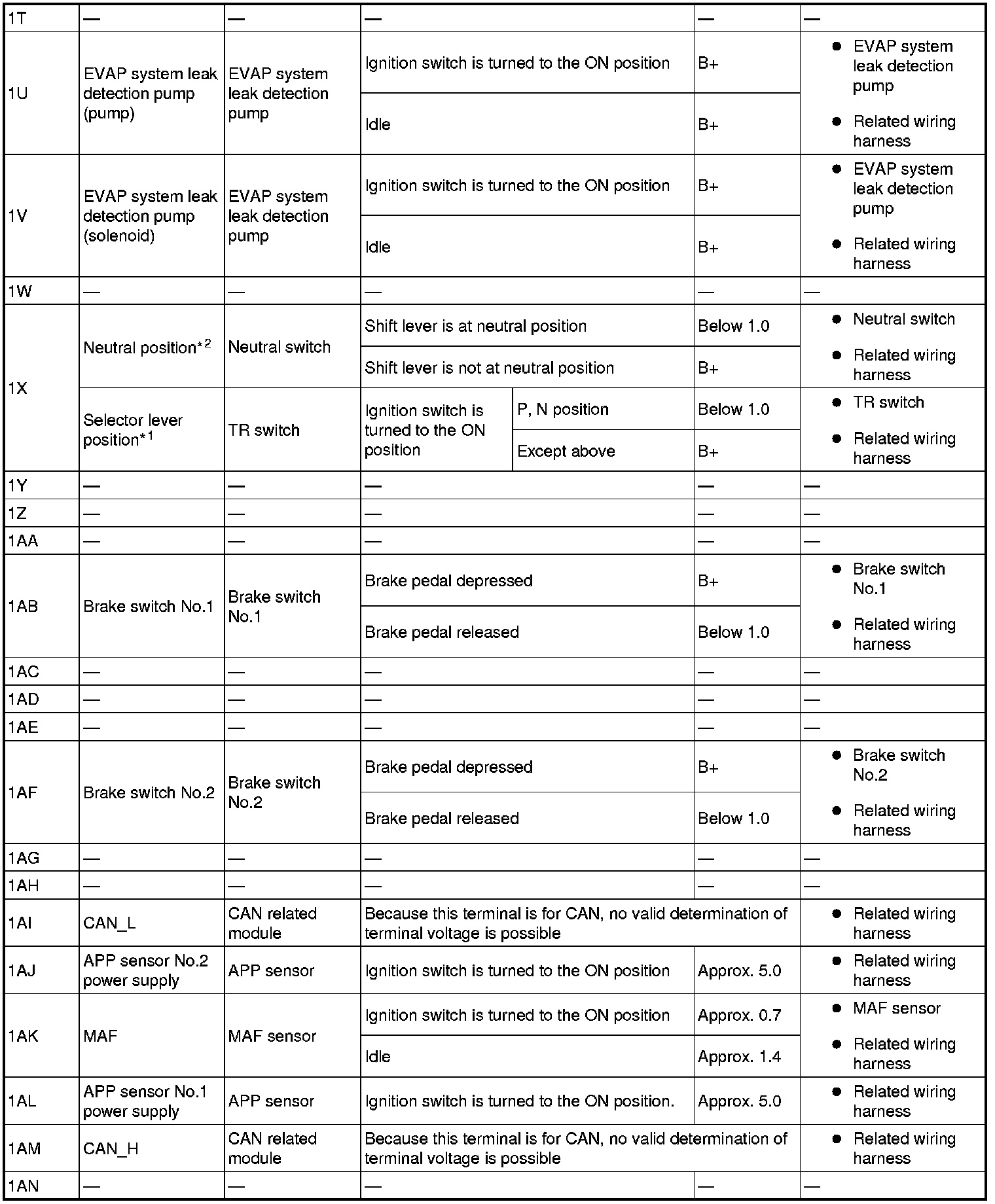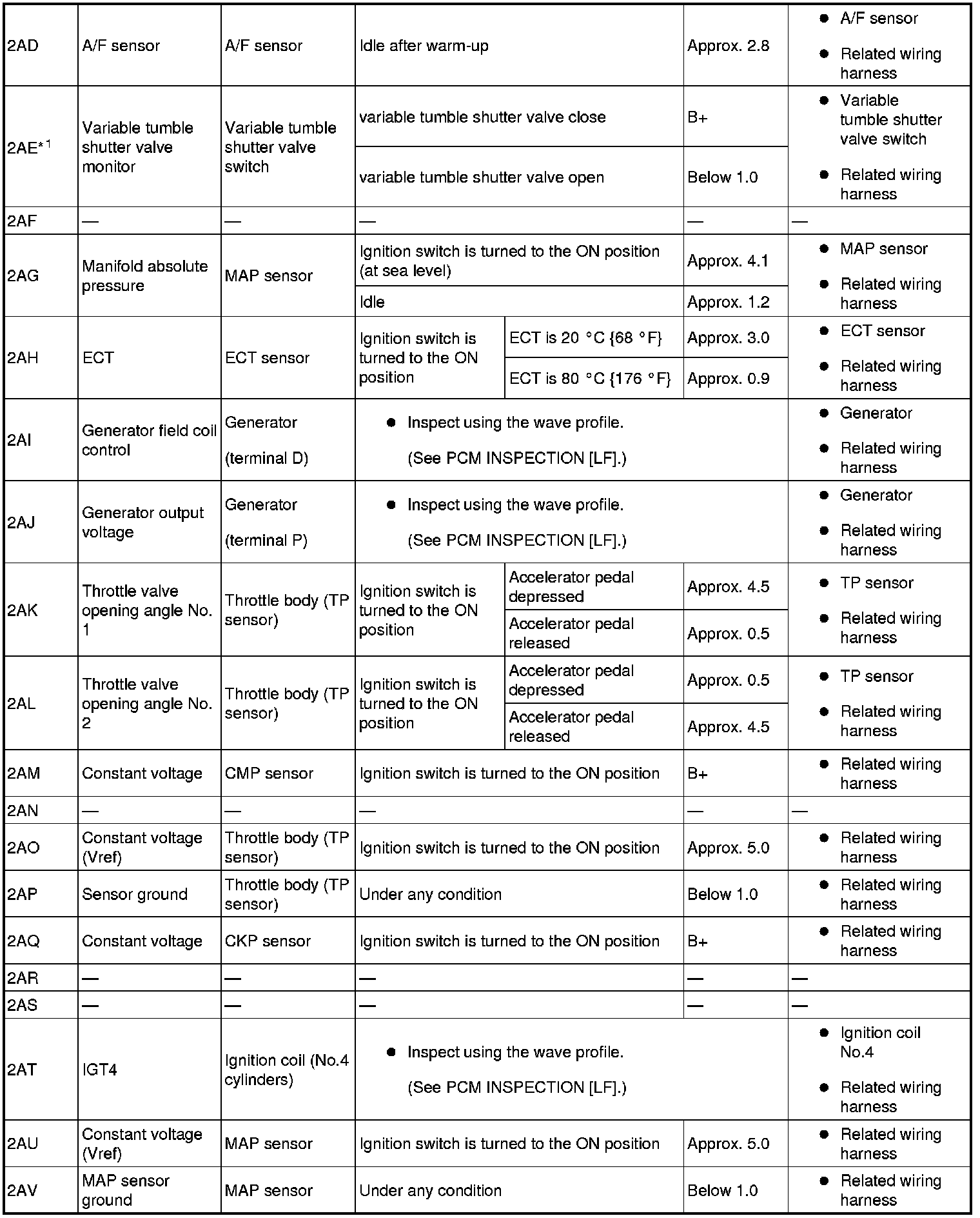 - The PCM terminal voltage can vary with the conditions when measuring and changes due to aged deterioration on the vehicle, causing false diagnosis. Therefore determine comprehensively where the malfunction occurs among the input systems, output systems, and the PCM.