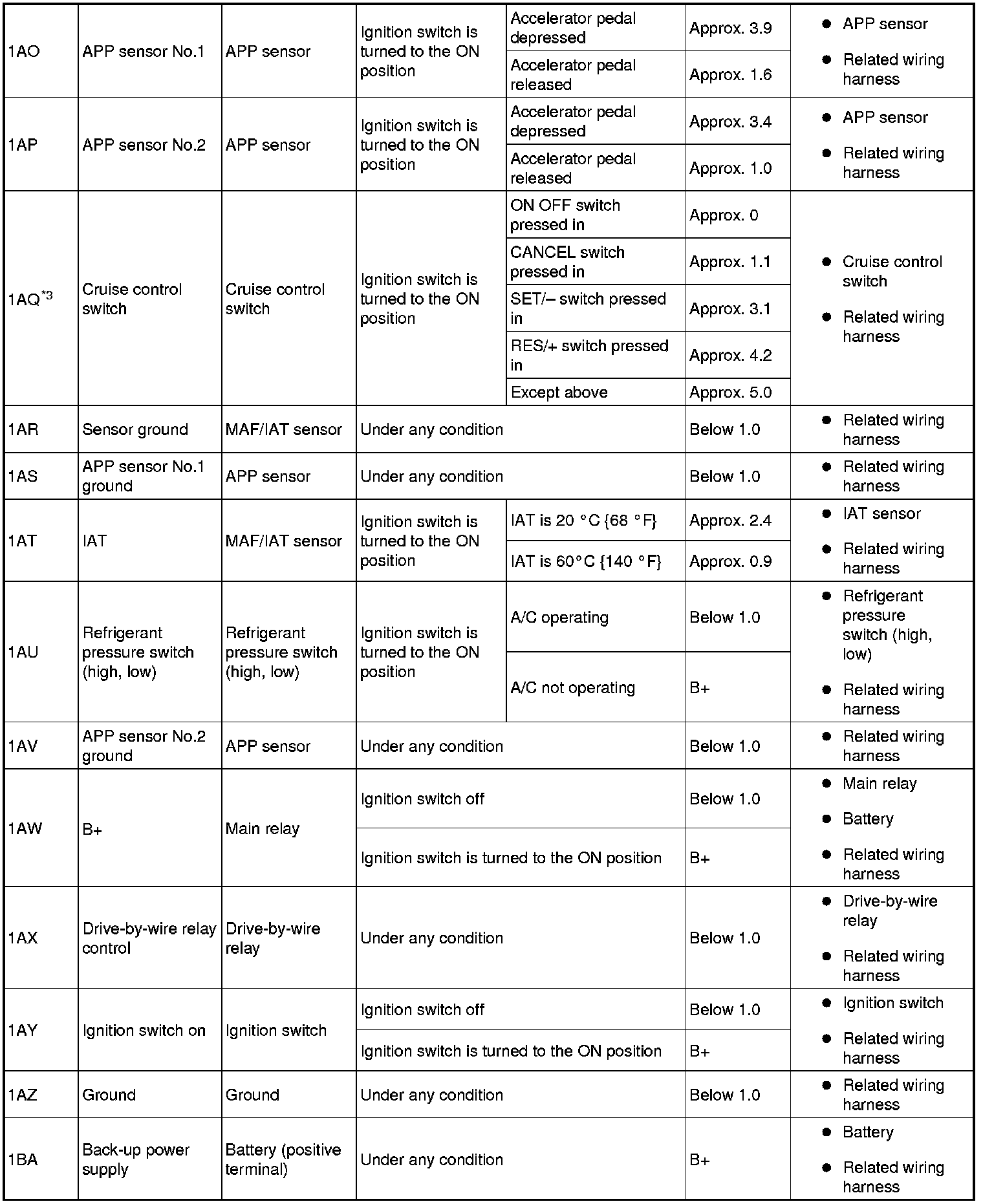 - For input/output signals except those of the monitoring items, use a voltmeter to measure the PCM terminal voltage.