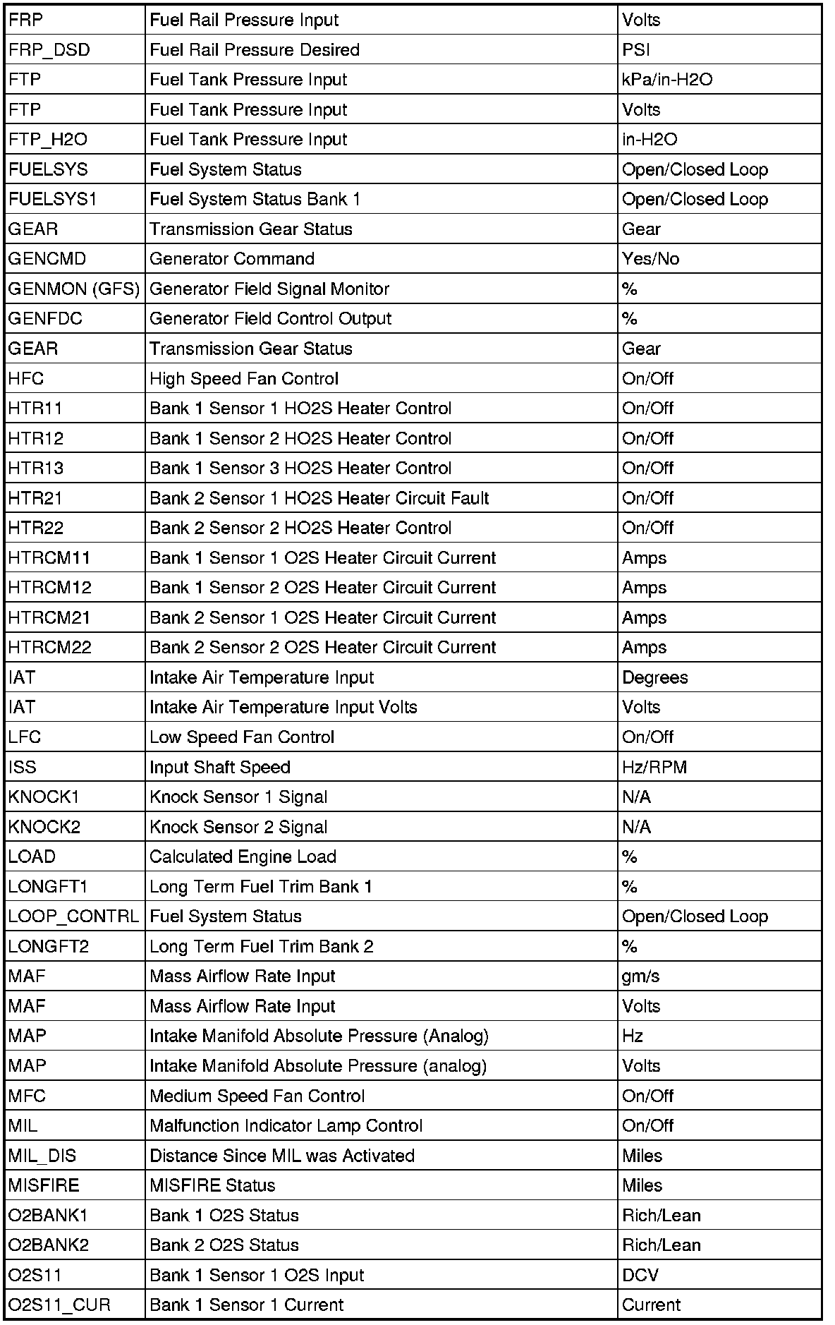 NOTE:This is not a complete list of Mazda PIDs available. This is a list of Mazda PIDs for engine control system troubleshooting.