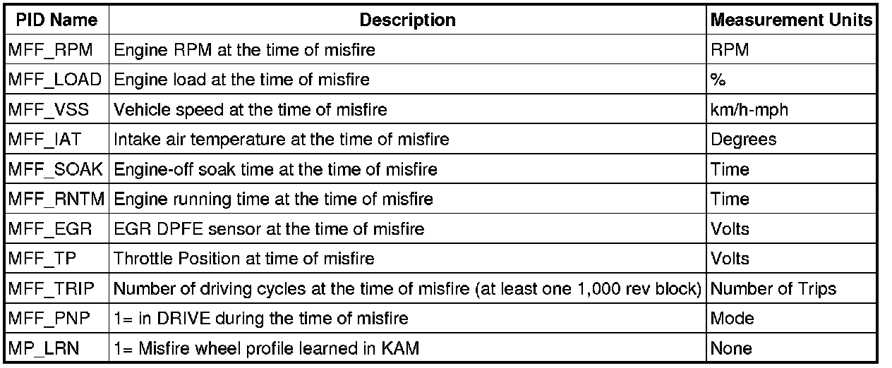 NOTE:MFF PIDs are supported on all vehicles, but may not be available on all scan tools because enhanced PID access may vary by scan tool manufacturer. Misfire Freeze-Frame PIDs