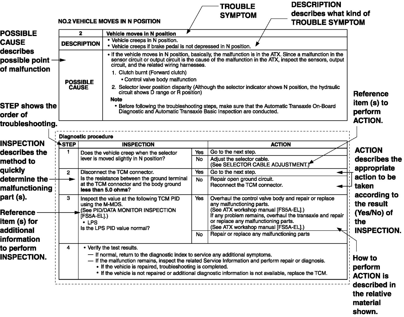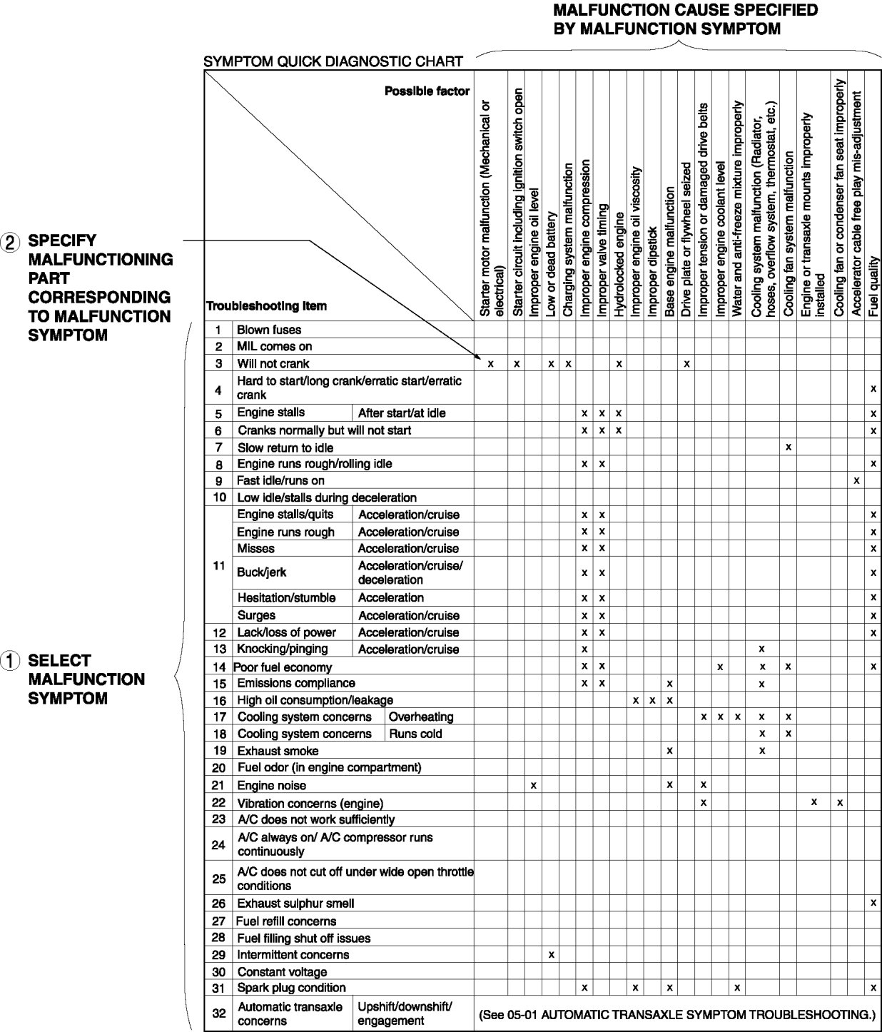 - The quick diagnosis chart lists diagnosis and inspection procedures to be performed specifically relating to the cause of the malfunction.