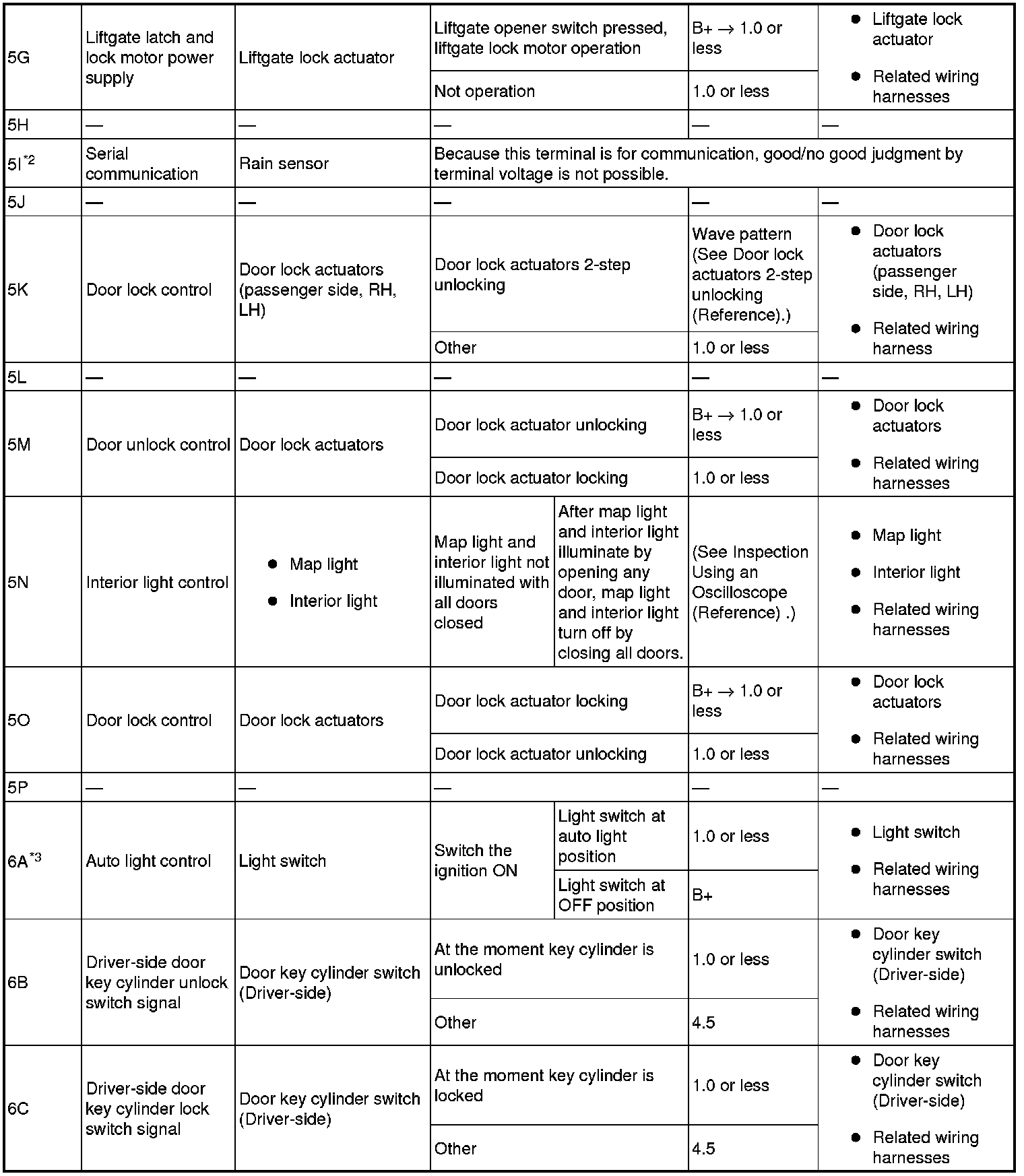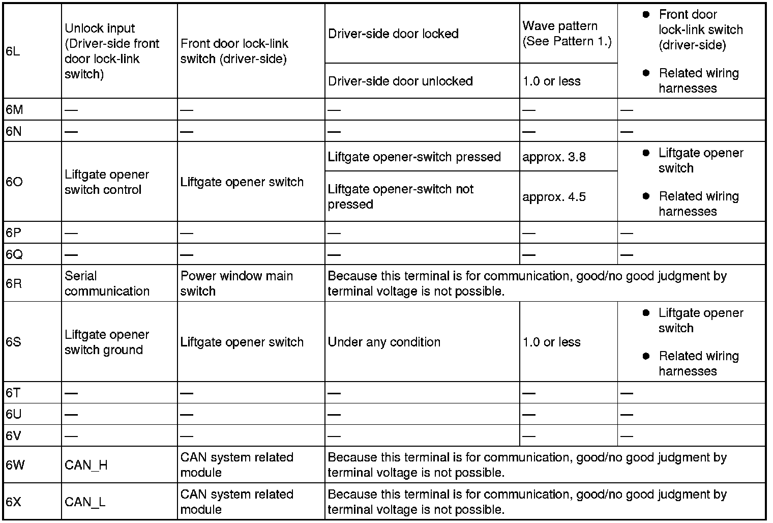 - Lock/unlock input (passenger-side front door lock-link switch) (sliding door lock link switch (RH, LH)): 6J (+) -> body ground (-)