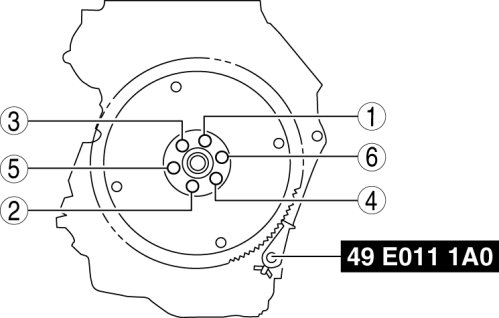 Tighten new drive plate installation bolts uniformly in two or three passes in the order shown in the figure.