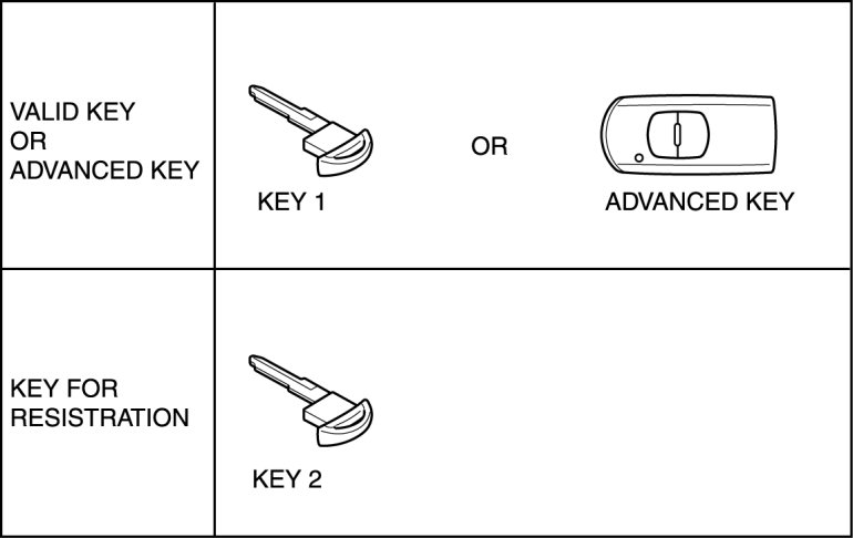 - The "Valid key" or "Valid advanced key" referred to in this information indicates the key that can start the engine.