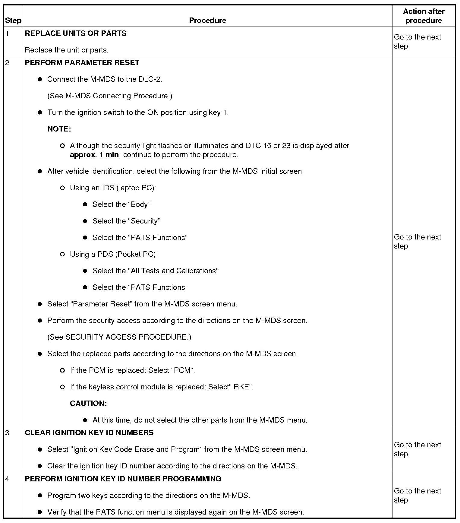 Immobilizer System-Related Parts Service and Programming Procedure Table