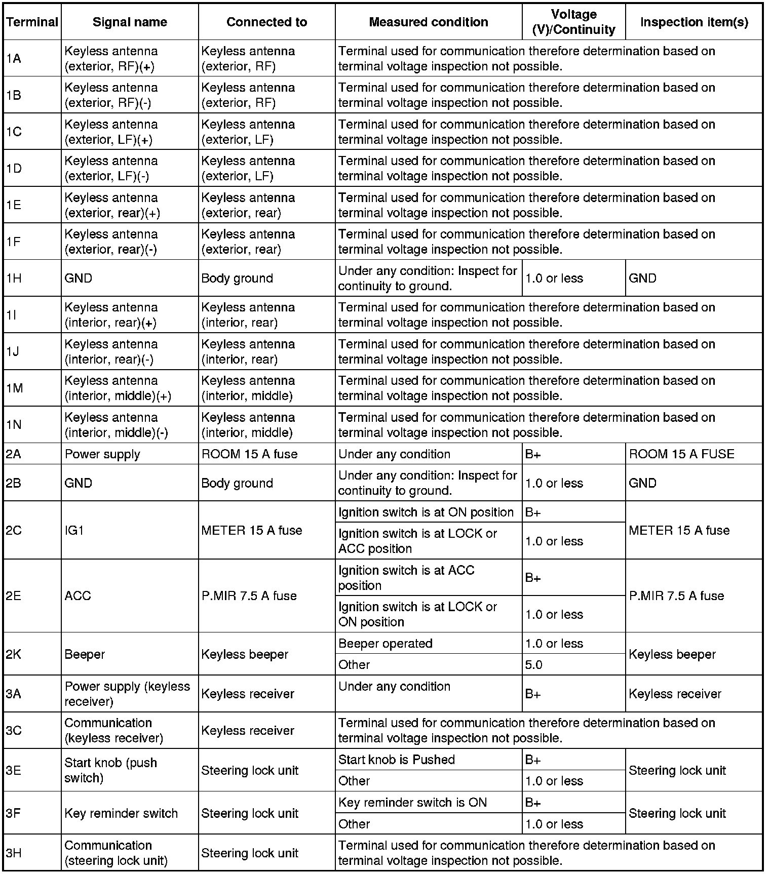 1. Measure the voltage or inspect for continuity according to the Terminal Voltage Table (Reference).