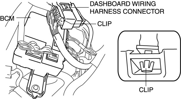 5. Remove the dashboard wiring harness connector clip from the BCM.