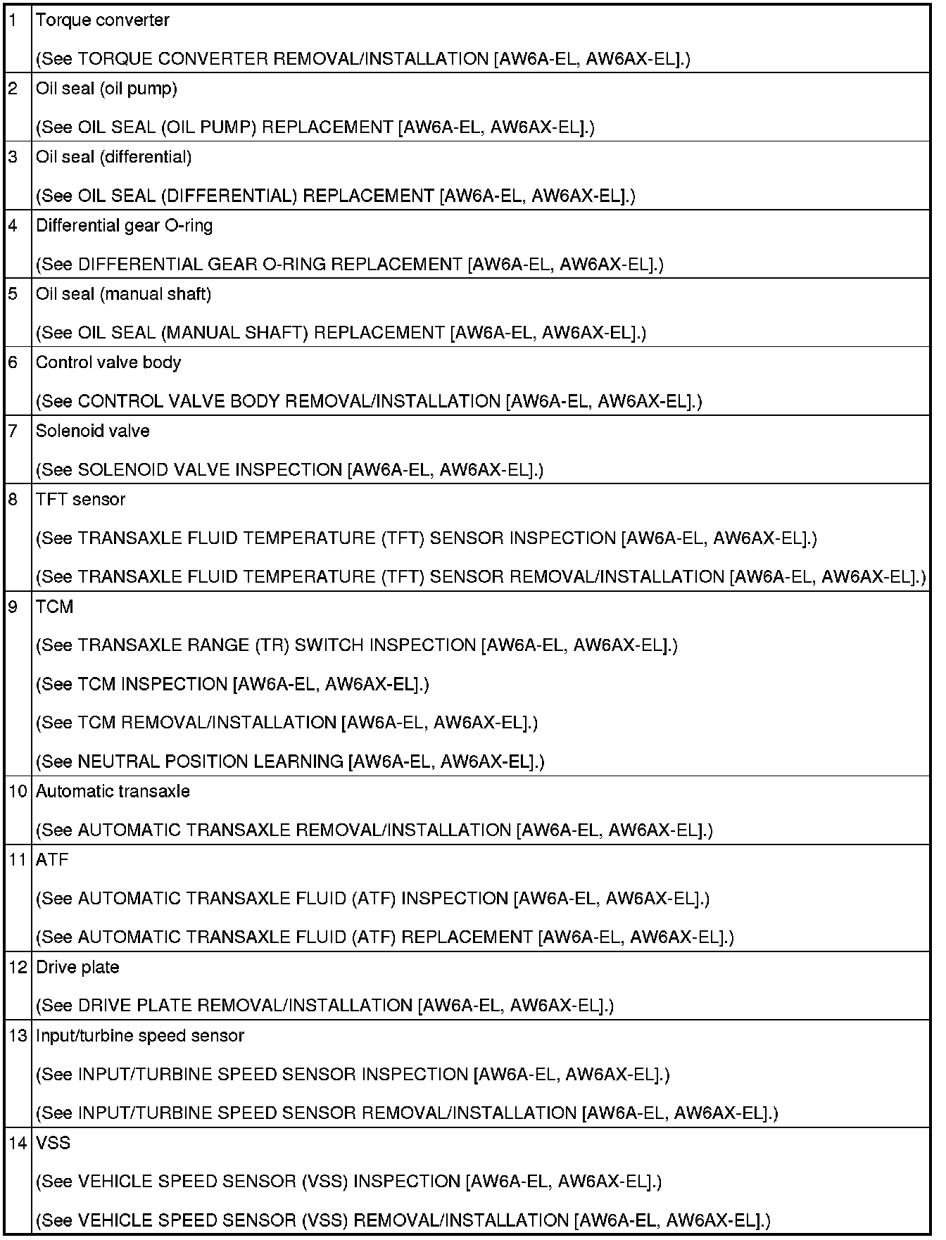 AUTOMATIC TRANSAXLE LOCATION INDEX [AW6A-EL, AW6AX-EL]