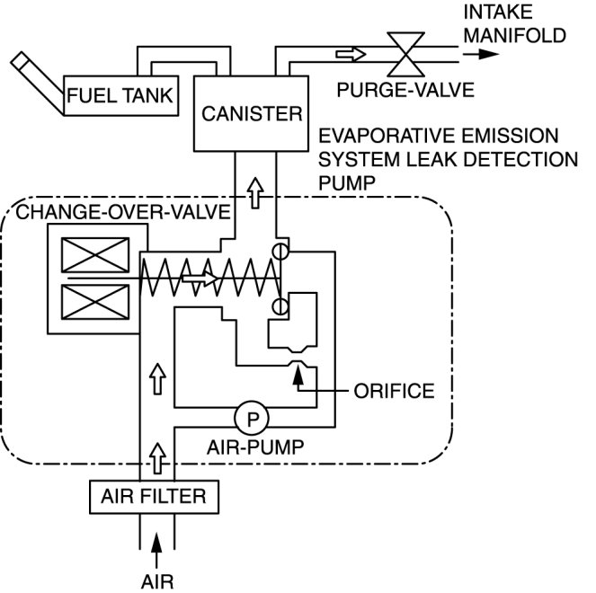 - The EVAP system test finds gas leaks in the system using the PCM to monitor changes in the air pump load current of the EVAP system leak detection pump. This test starts after sending an on-demand test signal from the M-MDS to the PCM. The PCM controls the air pump and change-over-valve operation and also stores the load current of the air pump as follows: