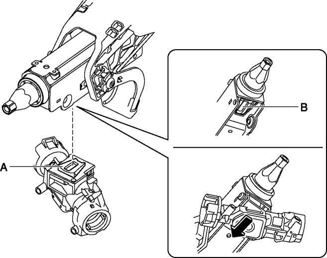 1. Assemble area A of the steering lock to area B of the steering shaft, and press the steering lock in the direction of the arrow in the figure until it contacts the steering shaft.