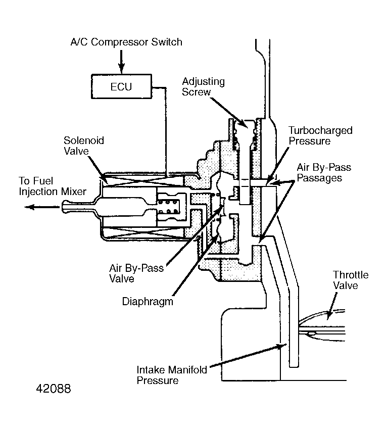 - Check curb idle speed and adjust if necessary. Turn A/C system on. Adjust engine speed to 1000-1100 RPM by turning adjusting screw on idle speed control system solenoid valve. See Figure .