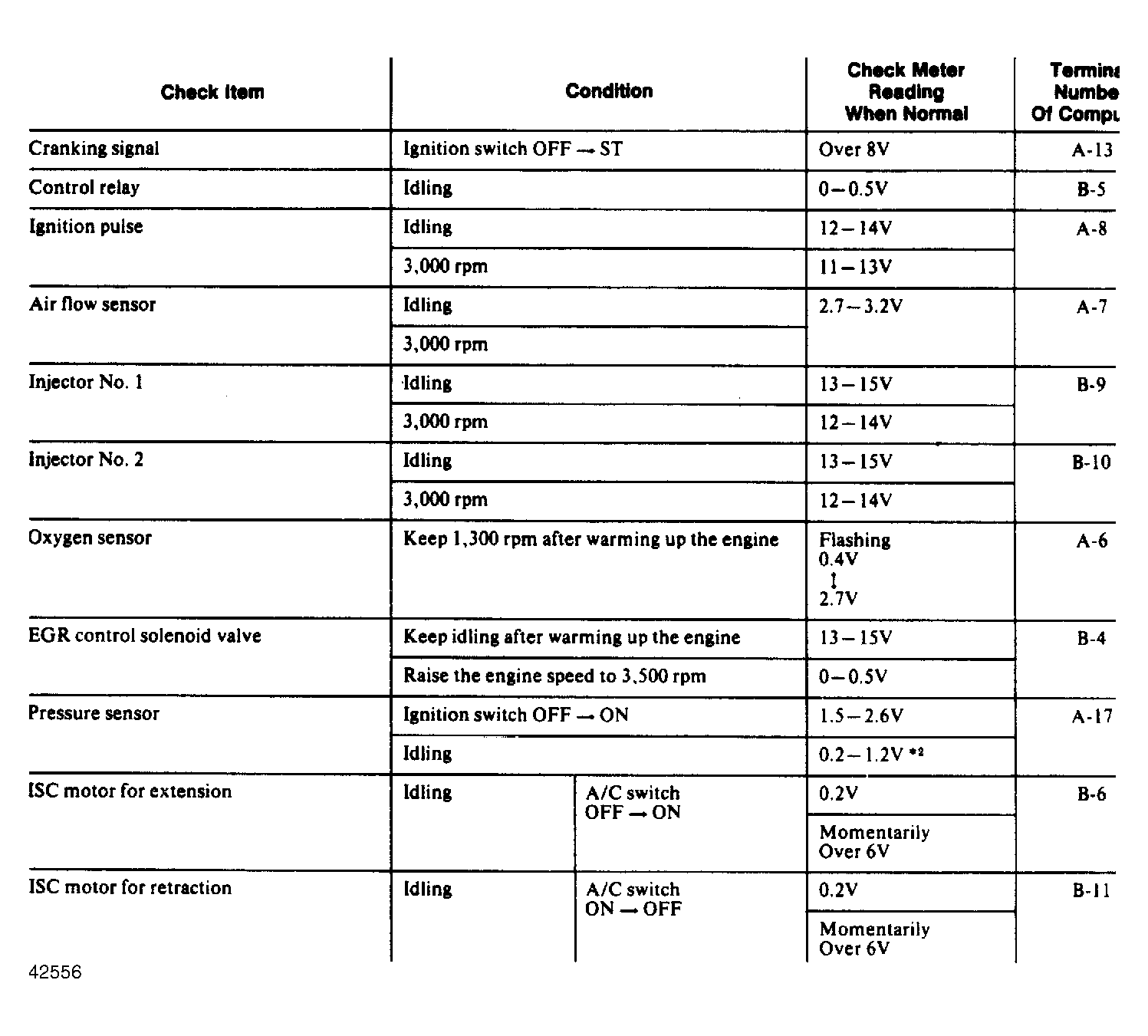 With voltmeter, use following charts to identify the pin connectors. See Figure . Check voltage of each terminal as specified in charts. Make sure ignition switch, vehicle operation and conditions are observed as called out in procedure.
