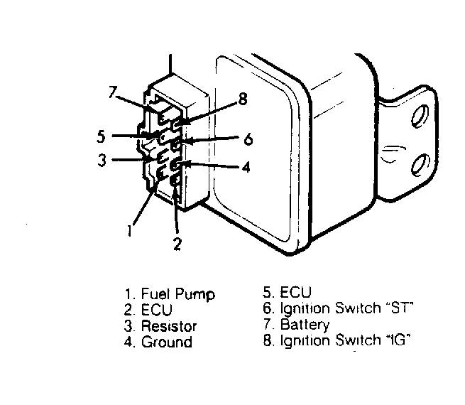 2. Apply 12 volts across terminals No. 8 (positive) and 4 (negative) while testing continuity between terminals No. 3 and 7. If continuity exists, relay is good. If not, replace relay.