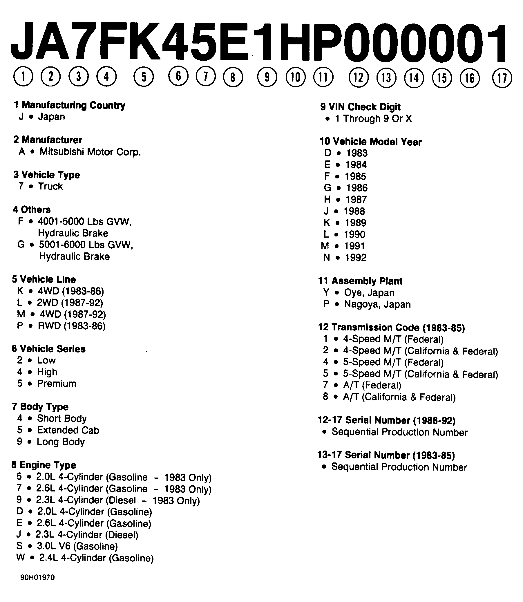 Home >> Mitsubishi >> 1987 >> Pickup SPX, 4WD >> Repair and Diagnosis >> Engine Performance >> Application >> Engine/VIN Id >> Model Identification >> VIN Code Id Explanation