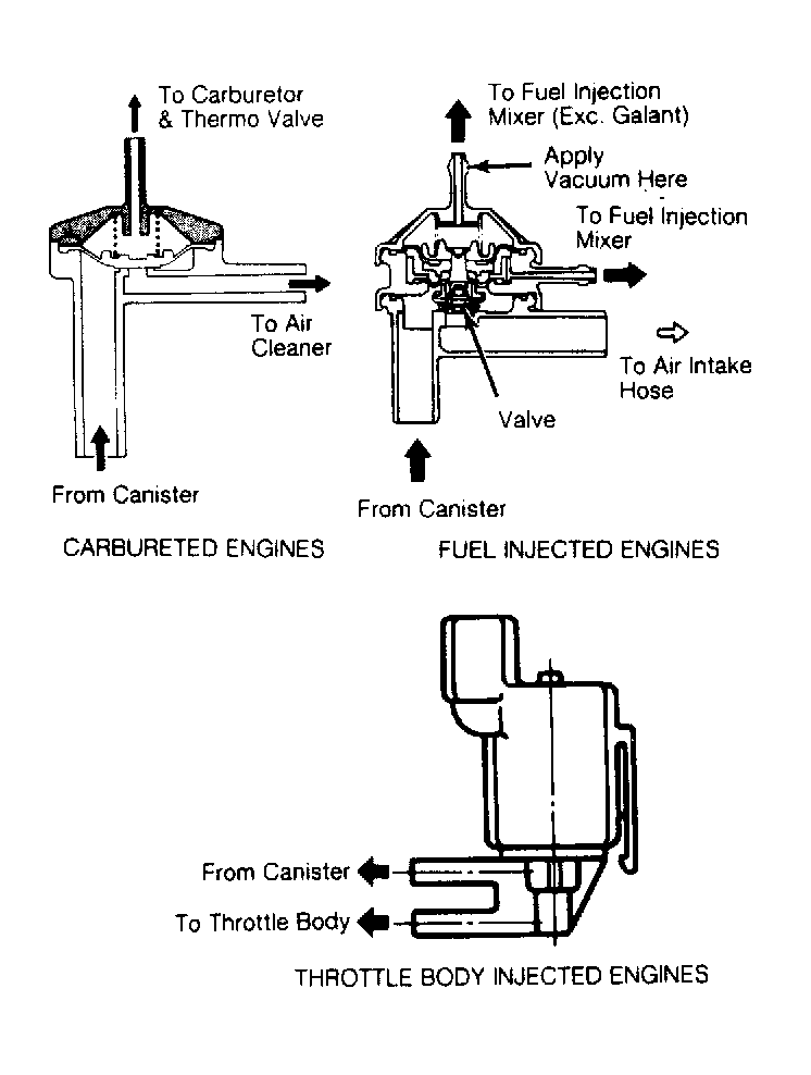 Disconnect hoses from purge control valve and remove valve. On all except Galant, Van and Wagon models, apply 7.8 in. Hg to top vertical nipple of purge control valve. On Galant, Van and Wagon models, apply 7.8 in. Hg to bottom nipple of purge control valve. See Figure . Blow into purge control valve's port to canister and check that air flows through valve. Replace valve if it does not operate as outlined.