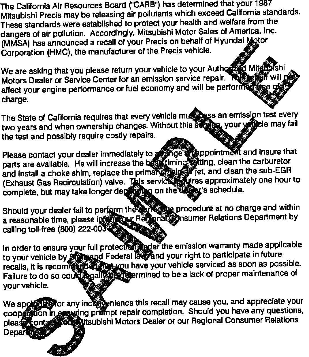 This bulletin provides detailed procedures for repairing the emission control system of certain 1987 Precis California certified models equipped with a 3 solenoid carburetor. A letter has been sent to owners of the affected vehicles telling them to return their vehicles to their Mitsubishi Motors Dealer to have the engine serviced. A copy of this letter on page 17 of this bulletin.