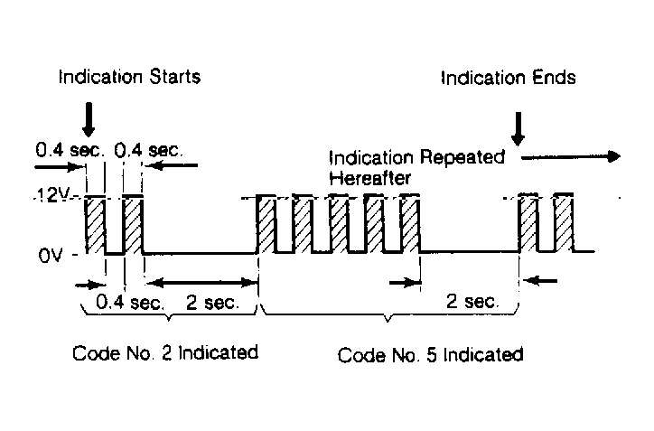 If 2 or more systems are non-functional, they are indicated in order of increasing code number. Indication is made by deflection of voltmeter pointer. A constant 12 volts indicates system is normal. If system is abnormal, voltmeter will alternate between 0 and 12 volts every 0.4 seconds. After indication of 0 volts for 2 seconds, the higher code is indicated. See Fig 1.