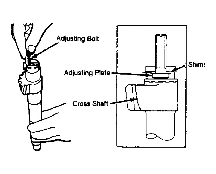 - Insert adjusting bolt and plate into "T" slot on top of cross shaft. Using adjusting plates, set cross shaft play to 0-.002" (0-.50 mm). See CROSS SHAFT ADJUSTING PLATE THICKNESS