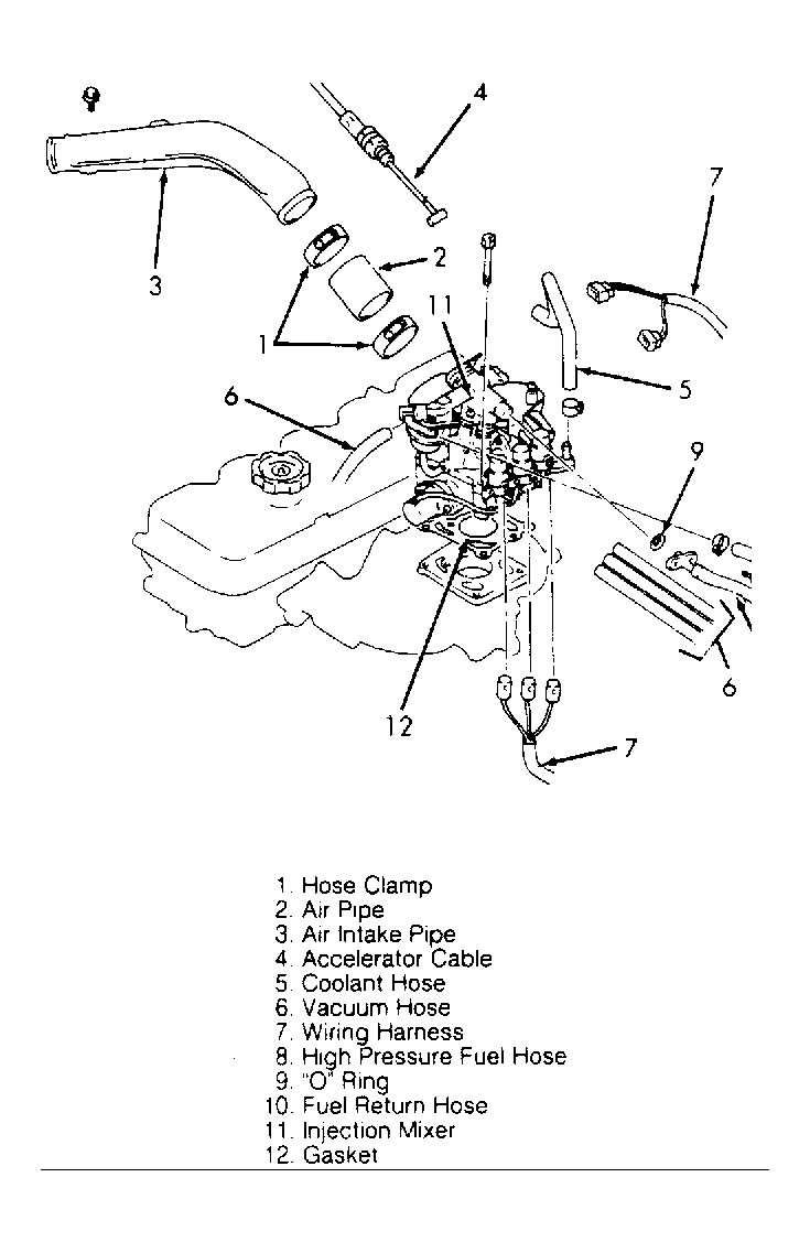 - Remove 2 hose clamps and air hose. Remove air intake pipe. Remove accelerator cable connection, coolant hose and vacuum hose connectors. Remove engine control wiring harness connnector. Remove high pressure fuel hose connection. Remove "O" ring and fuel return hose connection. Remove injector mixer and gasket from intake manifold. See Fig 1