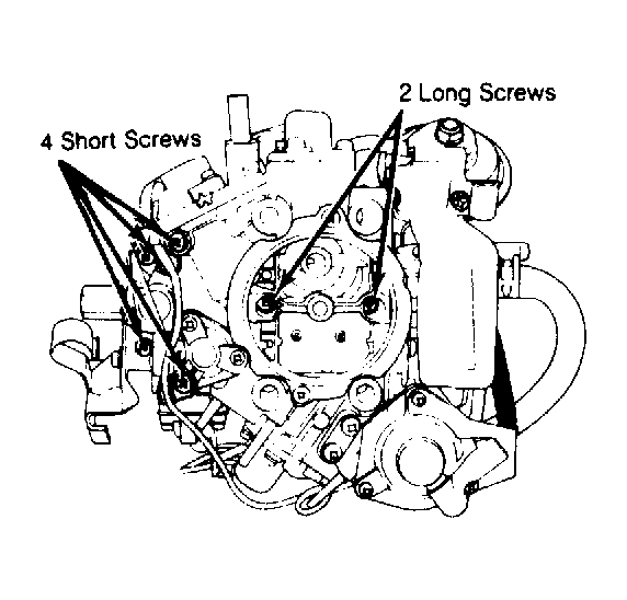 10. Remove choke unloader and vacuum hose. Remove throttle lever assemblies. Keep in order for reassembly purposes. Remove throttle position sensor. The idle mixture adjustment screw is accessible only by drilling and knocking out plug in carburetor base.
