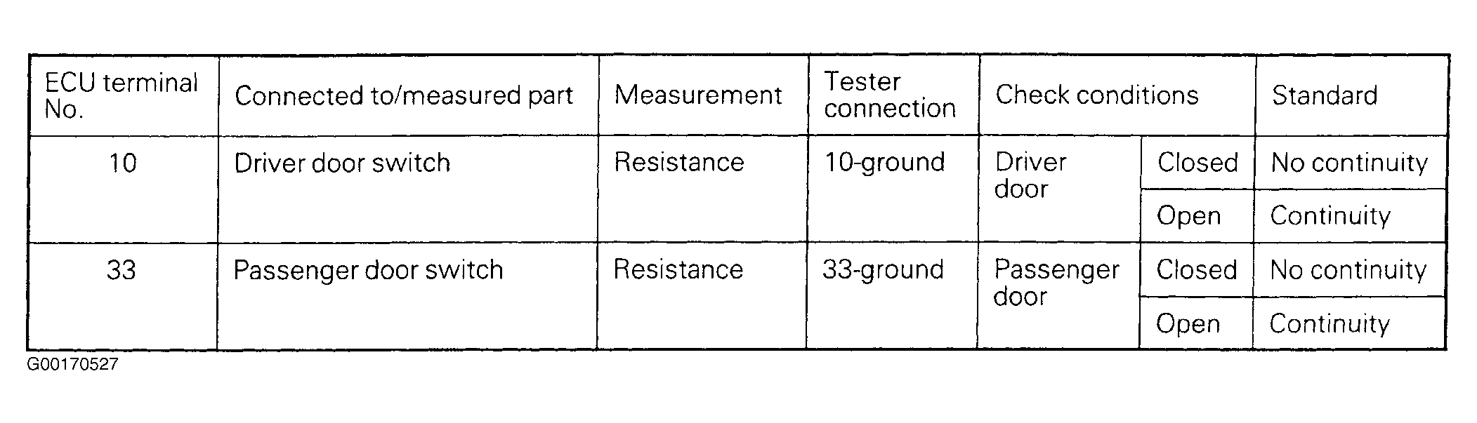 When the front door is closed (the door switch is switched OFF), HIGH-level signals are sent to the electronic control unit; when the front door is opened (the door switch is switched ON), LOW-level signals are sent to the electronic control unit. See Fig 1