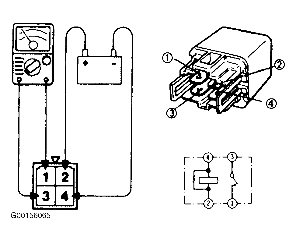 - Check for continuity between terminals 2 and 4 with no power supplied to relay. Terminals 2 and 4 should show continuity between them. If relay does not test as specified, replace relay.