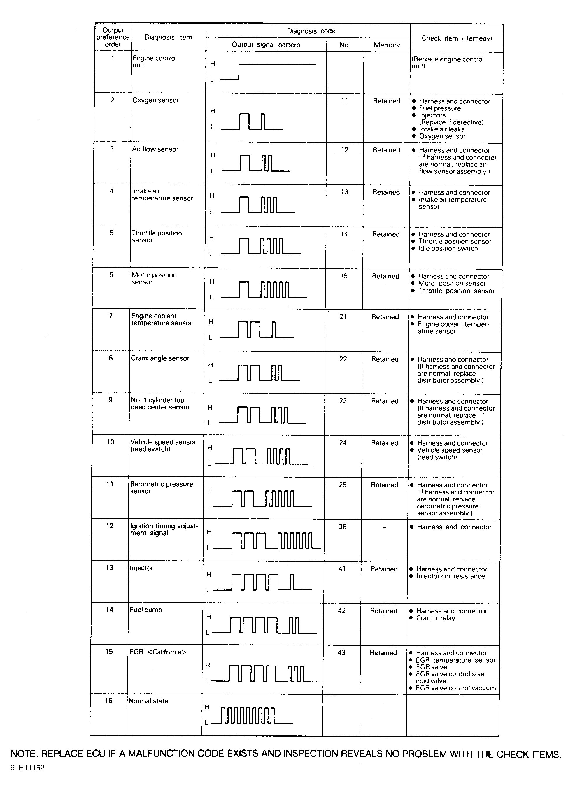 2. Ensure all accessories are off. Turn ignition switch to ON position and disclosure of ECU memory will begin. If 2 or more systems are non-functional, they are indicated by order of increasing code number.