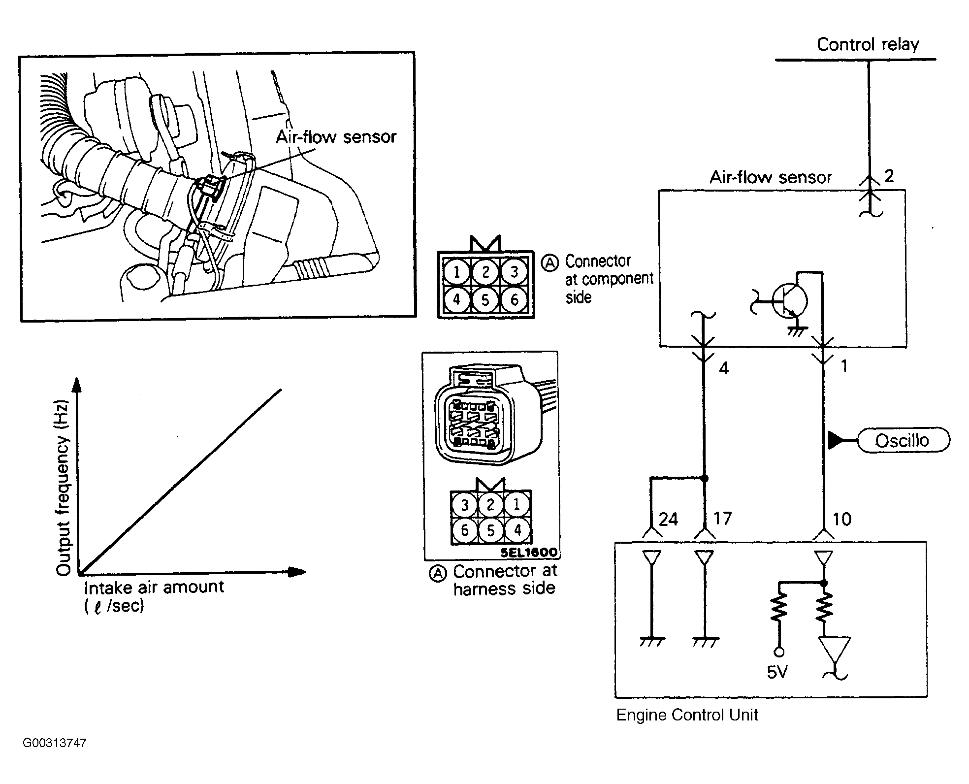 - The power for the airflow sensor is supplied from the control relay to the airflow sensor, and is grounded at the engine control unit. The airflow sensor, by intermitting the flow of the 5-volt signal applied from the engine control unit, produces pulse signals. See Fig 1