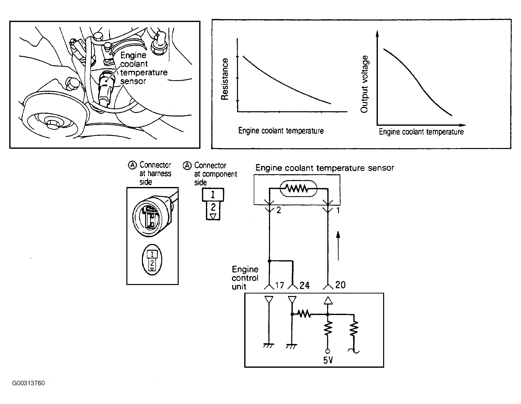 - The 5-volt power supply within the engine control unit is supplied, by way of the resistance within the unit, to the coolant temperature sensor. It passes through the coolant temperature sensor, which is a type of resistor, and is grounded at the engine control unit. Note that the resistance of the coolant temperature sensor decreases when the temperature of the coolant increases. See Fig 1