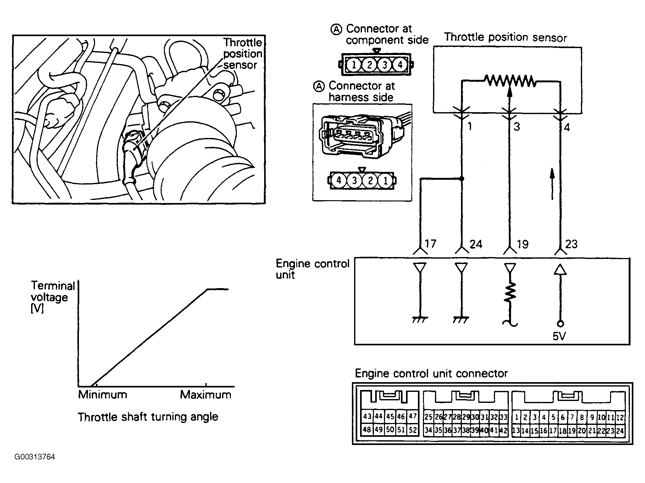 - The 5-volt power supply within the engine control unit is supplied to the throttle position sensor, after which it passes through the resistance within the sensor and is grounded at the engine control unit. See Fig 1