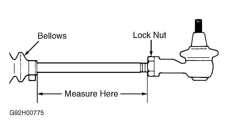 Install tie rod end ball joint to rack. Tighten tie rod ball joint-to-rack nut to specification. See TORQUE SPECIFICATIONS table. Install boots and boot clamps. Adjust tie rod end lock nuts until distance between bellows and lock nut is as specified. See Fig 1 . See the TIE ROD LOCK NUT INSTALLATION SPECIFICATIONS table.