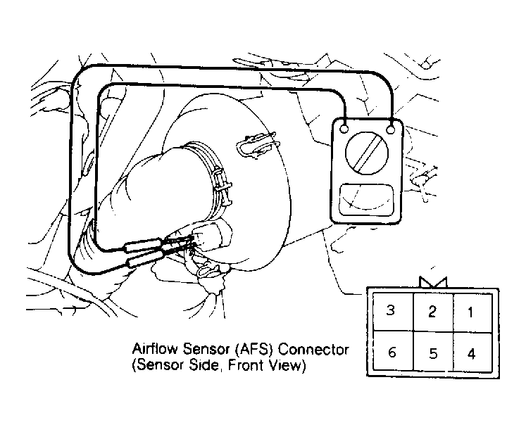 Disconnect airflow sensor connector. Check intake air temperature sensor by measuring resistance between terminals No. 4 (Green/Brown wire on 1.5L and 2.4L, Green/Black wire on 3.0L) and No. 6 (Black wire). See Figure . Using a hair dryer, warm intake air temperature sensor while watching ohmmeter. Resistance value should change evenly as temperature rises. Replace airflow sensor assembly if resistance is not within specification, or values do not change while warming sensor. See INTAKE AIR TEMPERATURE SENSOR RESISTANCE table.
