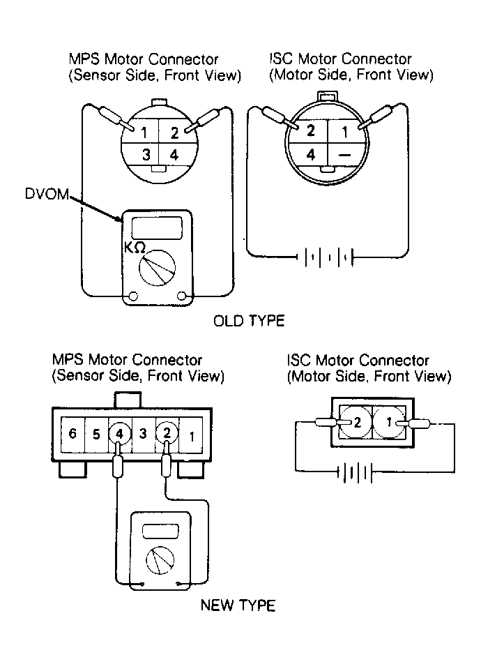 1. Disconnect ISC motor connector. Check motor coil continuity between terminals No. 1 and 2. See Figure . Resistance should be 5-35 ohms. If resistance is zero ohms or far more than specification, an open or short exists in motor coil. Replace ISC servo assembly.