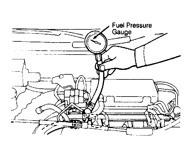 3. Start engine. Ensure no fuel leakage is present from the pressure gauge or connection. Disconnect vacuum hose from fuel pressure regulator and plug the hose end.