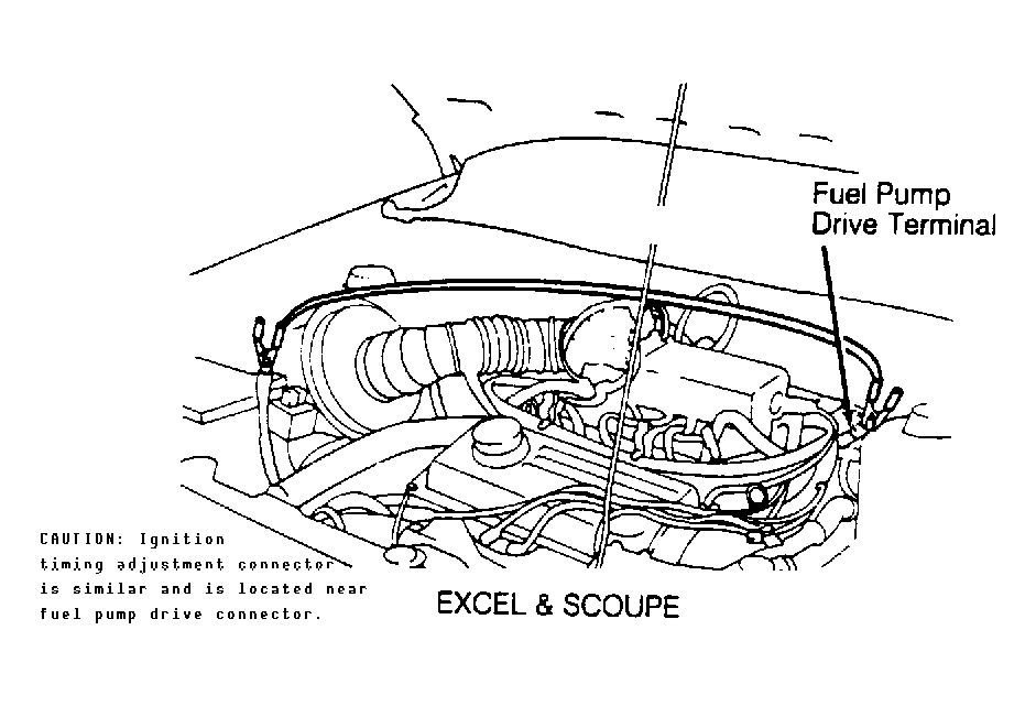 Turn ignition switch to OFF position. Apply battery voltage to fuel pump drive connector (Yellow wire on Excel, Scoupe and Precis, White/Black wire on Sonata). See Fig 1 or Fig 2 . Remove fuel tank cap and listen for fuel pump operation. Pinch fuel hoses by hand and ensure fuel pressure can be felt.