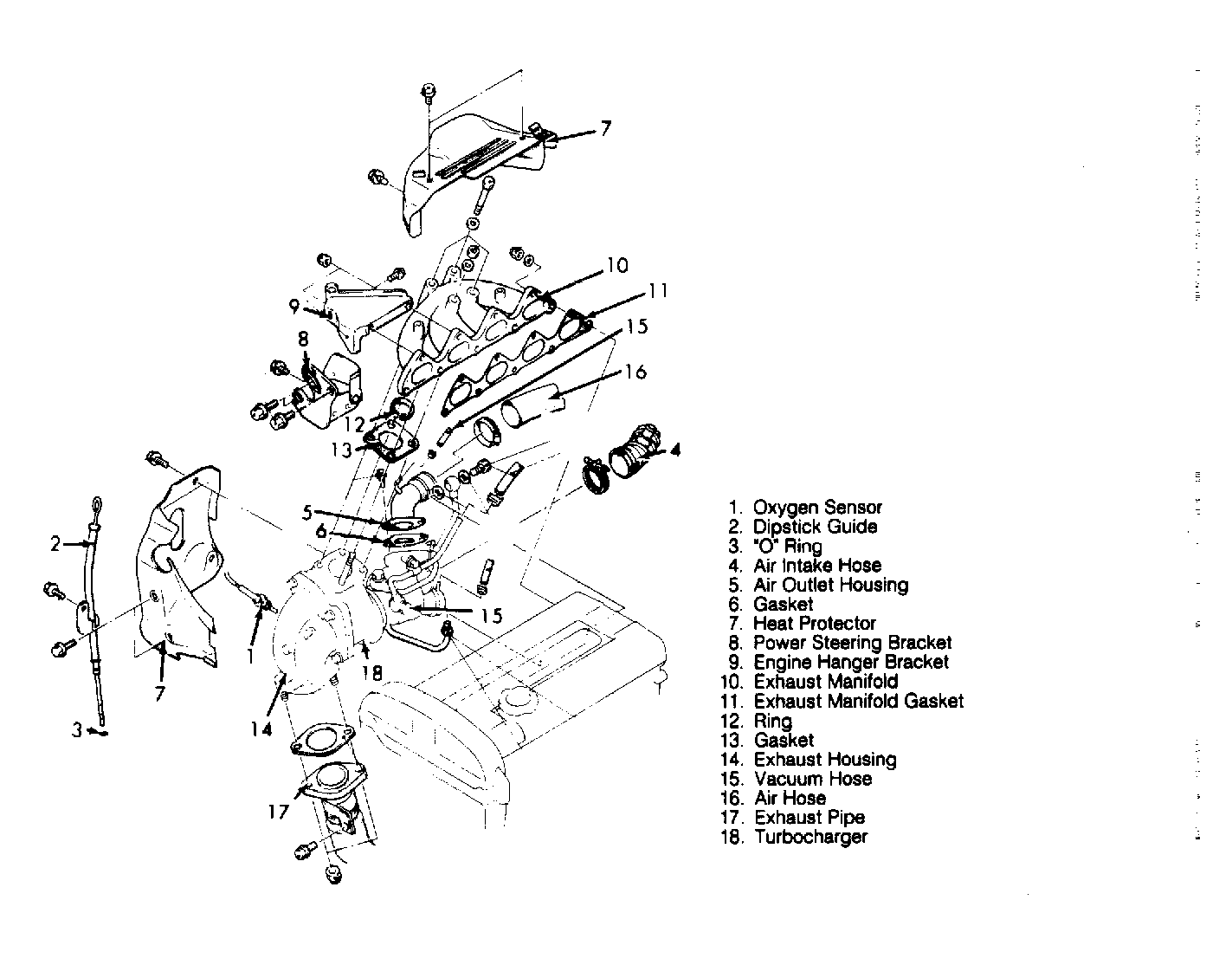 - Disconnect air intake hose and vacuum hoses. Remove air hose and air outlet housing. Remove heat protectors. Disconnect exhaust pipe. Remove power steering oil pump and bracket. Remove engine hanger bracket. Disconnect oil inlet pipe. See Fig 2