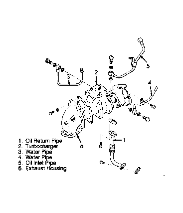 - Disconnect coolant hose and tubes. Remove nuts and bolts securing exhaust manifold. Remove exhaust manifold and gaskets. Disconnect oil return pipe. Remove turbocharger assembly.