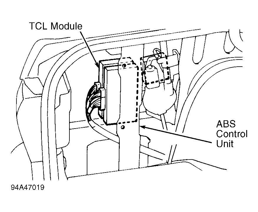 - Start and run engine. If ABS warning light is on, further diagnostic testing of ABS system is required. See the appropriate ANTI-LOCK BRAKE SYSTEM article in the BRAKES section. If ABS light is off, turn ignition off. Disconnect TCL module harness connector. See Figure . Disconnect ABS ECU harness connector. See Figure .