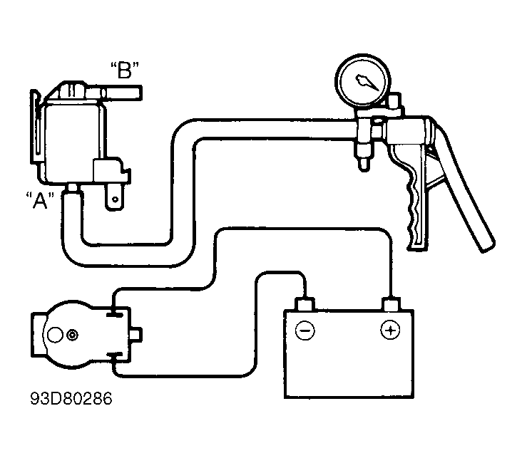 4. Remove vacuum hoses from solenoid. Ensure solenoid harness connector is disconnected. Connect a vacuum pump to solenoid nipple "A". Use jumper wires to connect battery voltage to solenoid terminals. See Fig 1 . With vacuum applied, nipple "B" unplugged, and negative jumper wire connected, solenoid should hold vacuum.