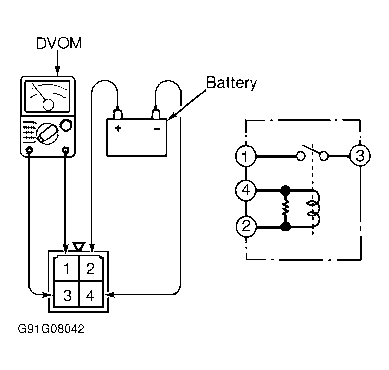 3. Apply battery voltage to terminal No. 2, and ground terminal No. 4. Check for continuity between terminals No. 1 and 3. If continuity exists, relay is okay. If continuity does not exist, replace relay.
