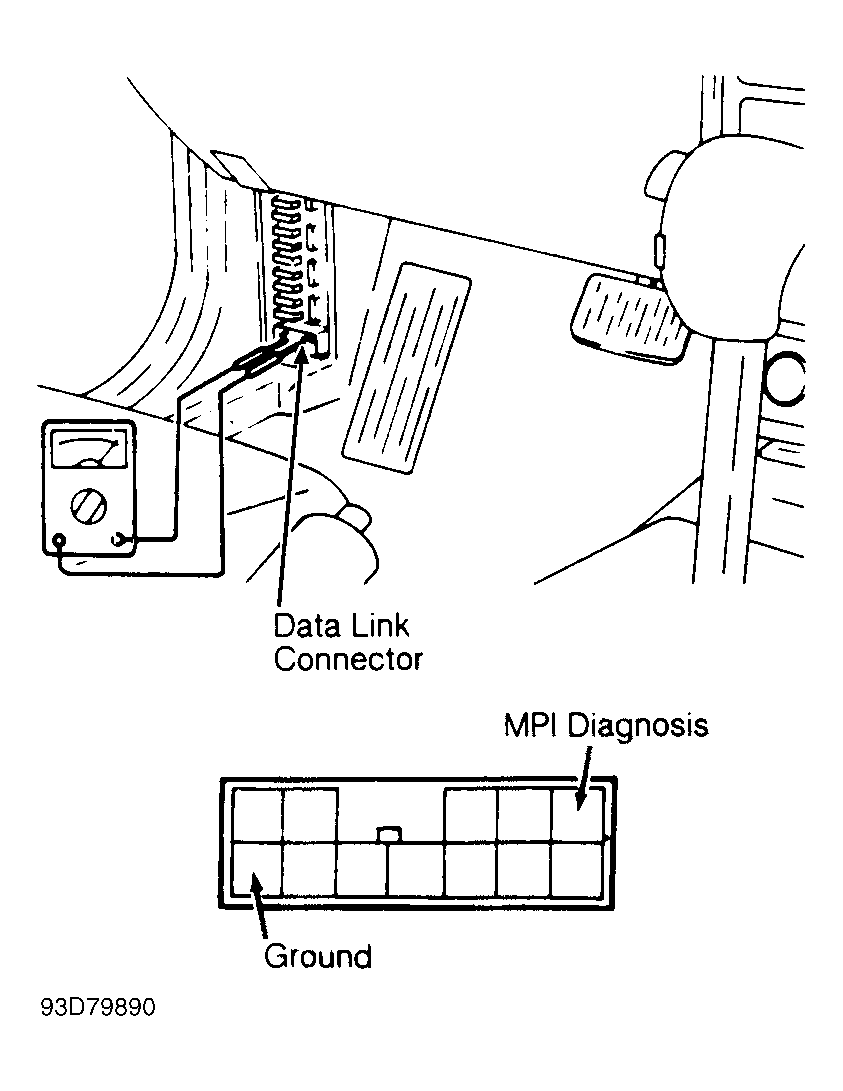1. Before entering on-board diagnostics, refer to SERVICE PRECAUTIONS  . Turn ignition switch to OFF position. Locate Data Link Connector (DLC), next to fuse block. Connect voltmeter positive lead to Data Link Connector (DLC) MPI diagnosis terminal and negative lead to ground terminal. See Fig 1 .