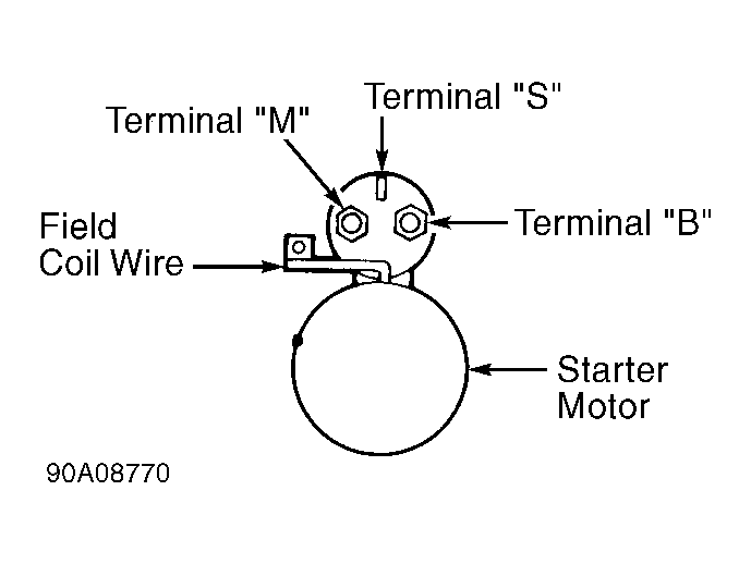 1. Disconnect field coil wire from terminal "M" at starter solenoid. See Figure. Connect jumper wire between positive battery terminal of 12-volt battery and terminal "M" of starter solenoid.